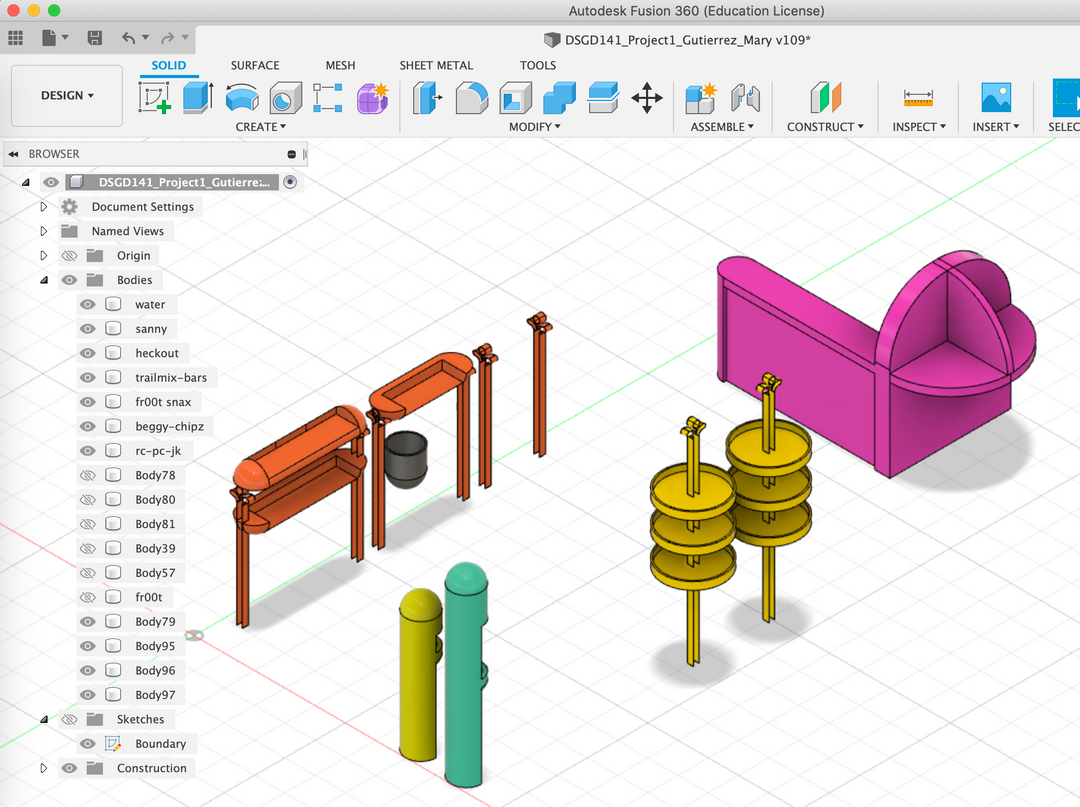 I learned about ADA compliancy for the first time, learned more about college food insecurity and sustainability, and I also got much more familiar with Fusion 360 and how to think in 3D—there is no a "back", so we must design with all views in mind.